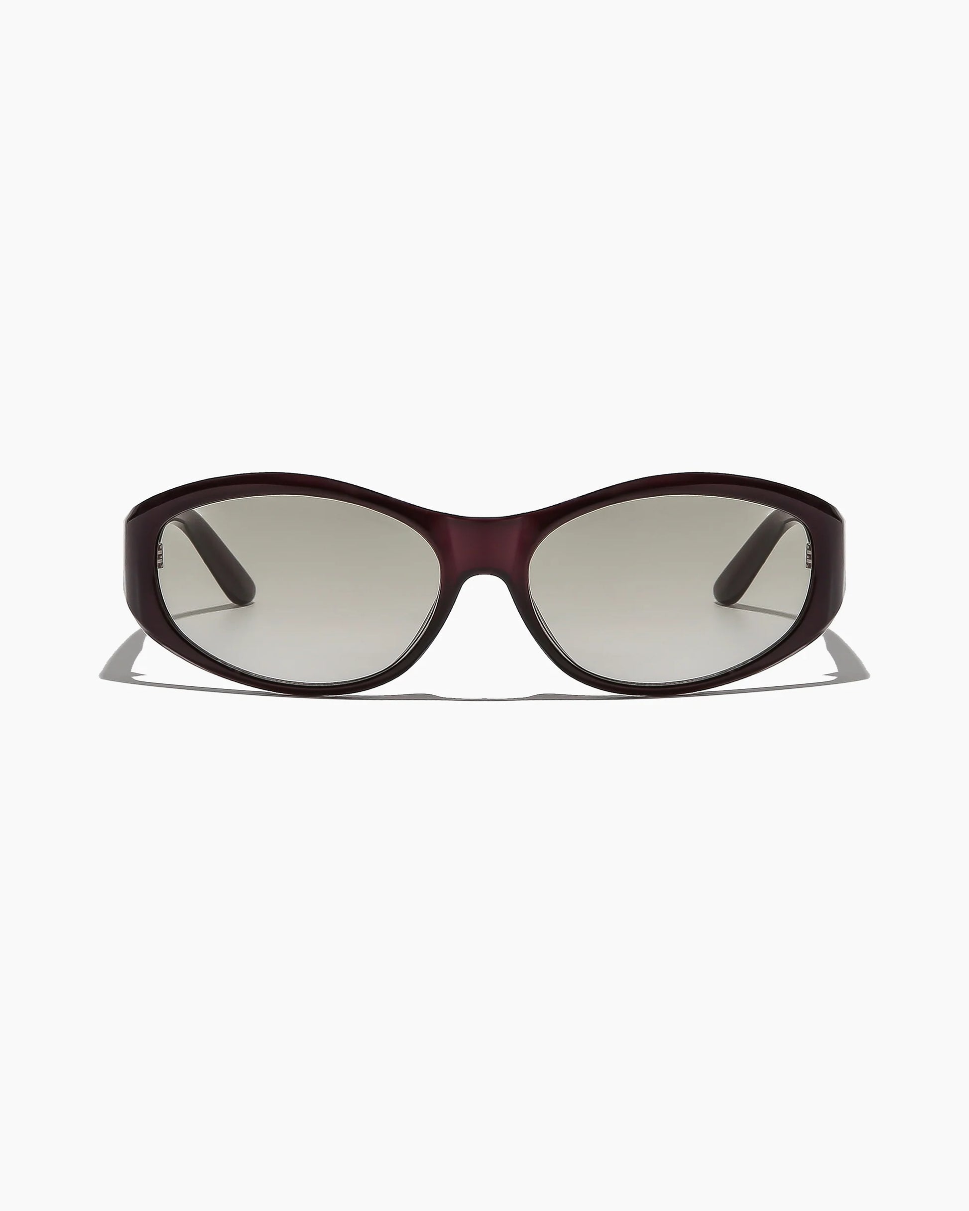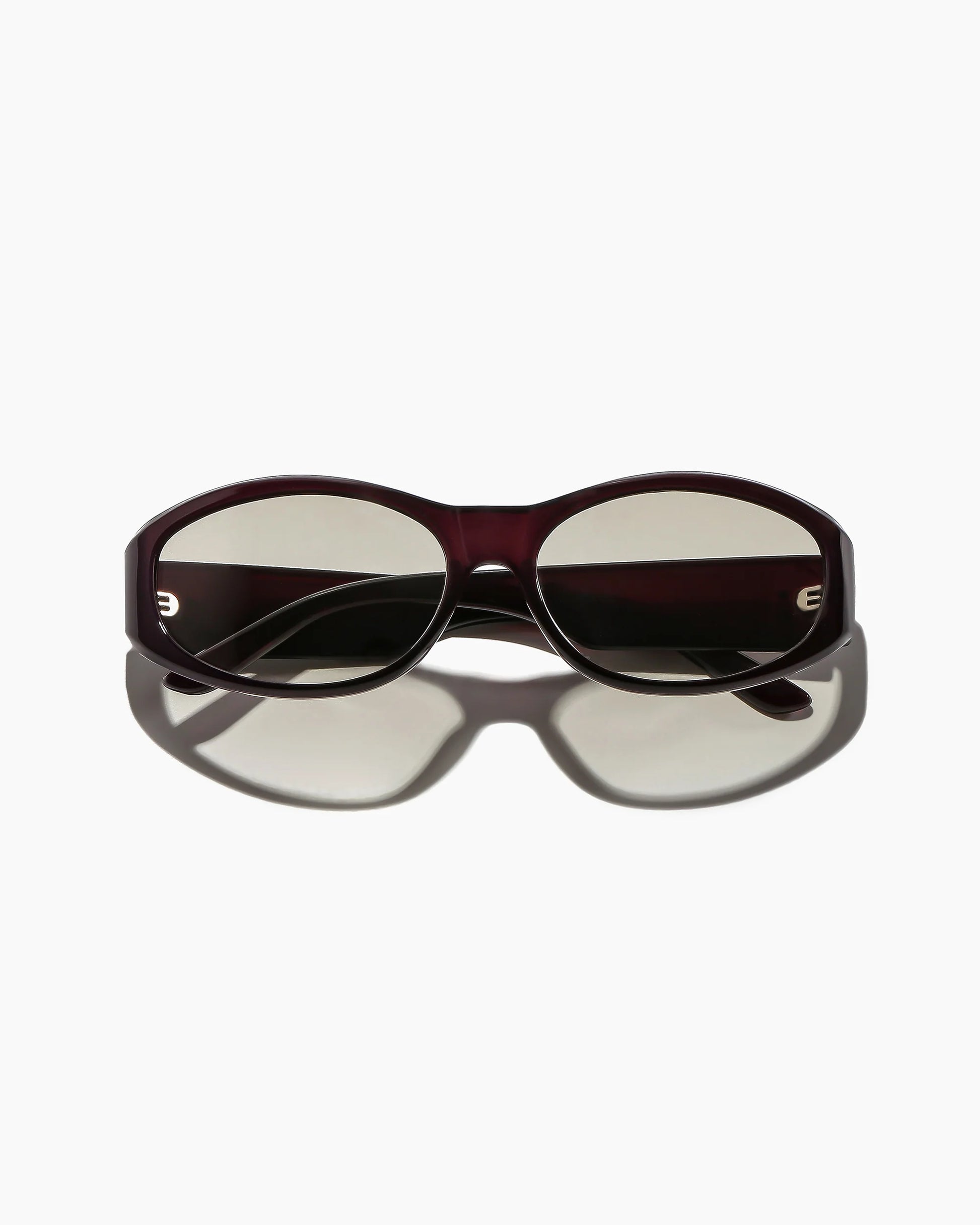 meet brooks ; funky meets functional in these versatile oval sunglasses featuring a slightly wrapped base curve. ultra cool proportions with sharp bevelling will make this deep purple sunglass with super light tinted green lenses your summer go-to.