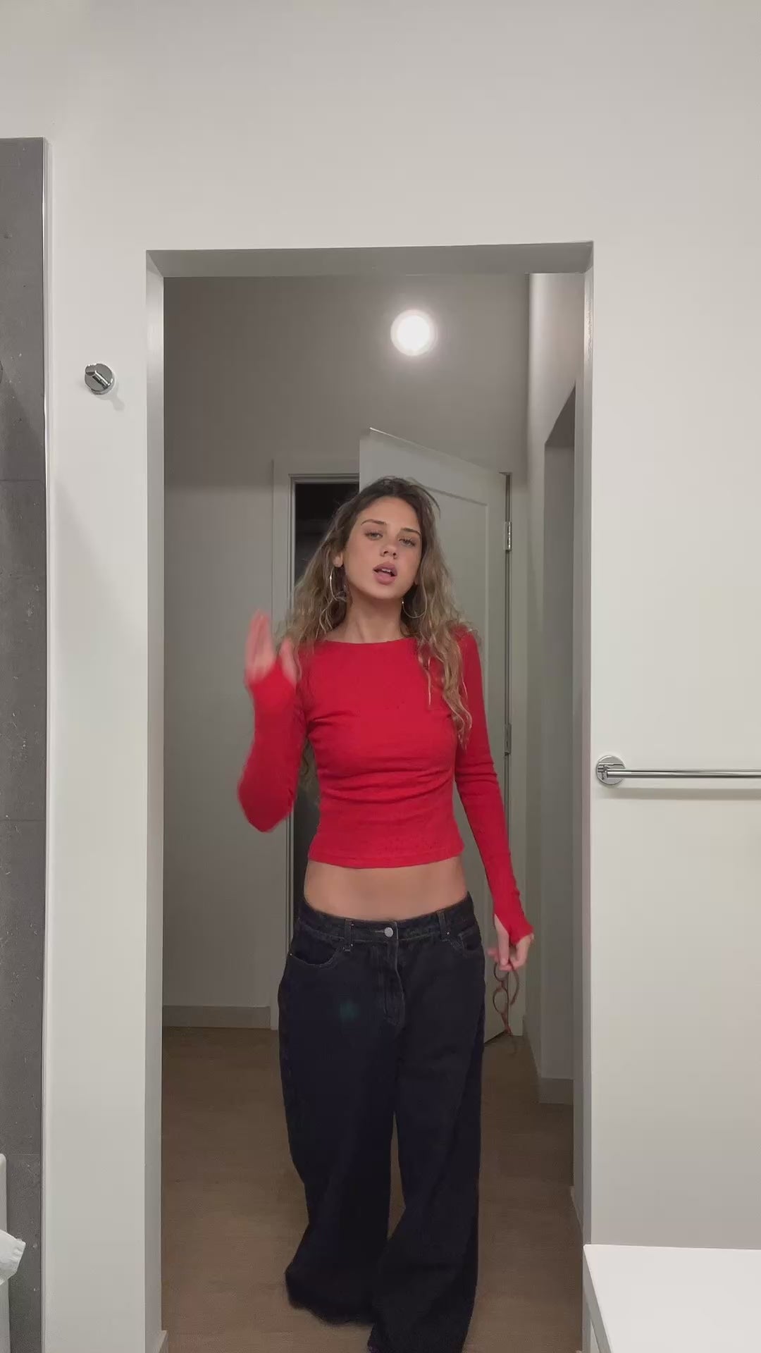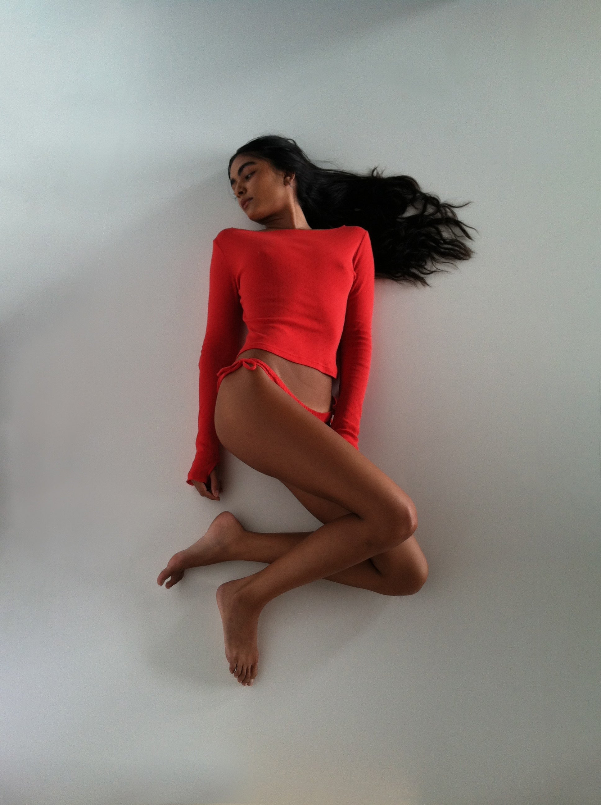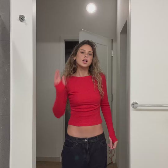 classic long sleeve in ruby red featuring a raw edge high neckline and thumb holes