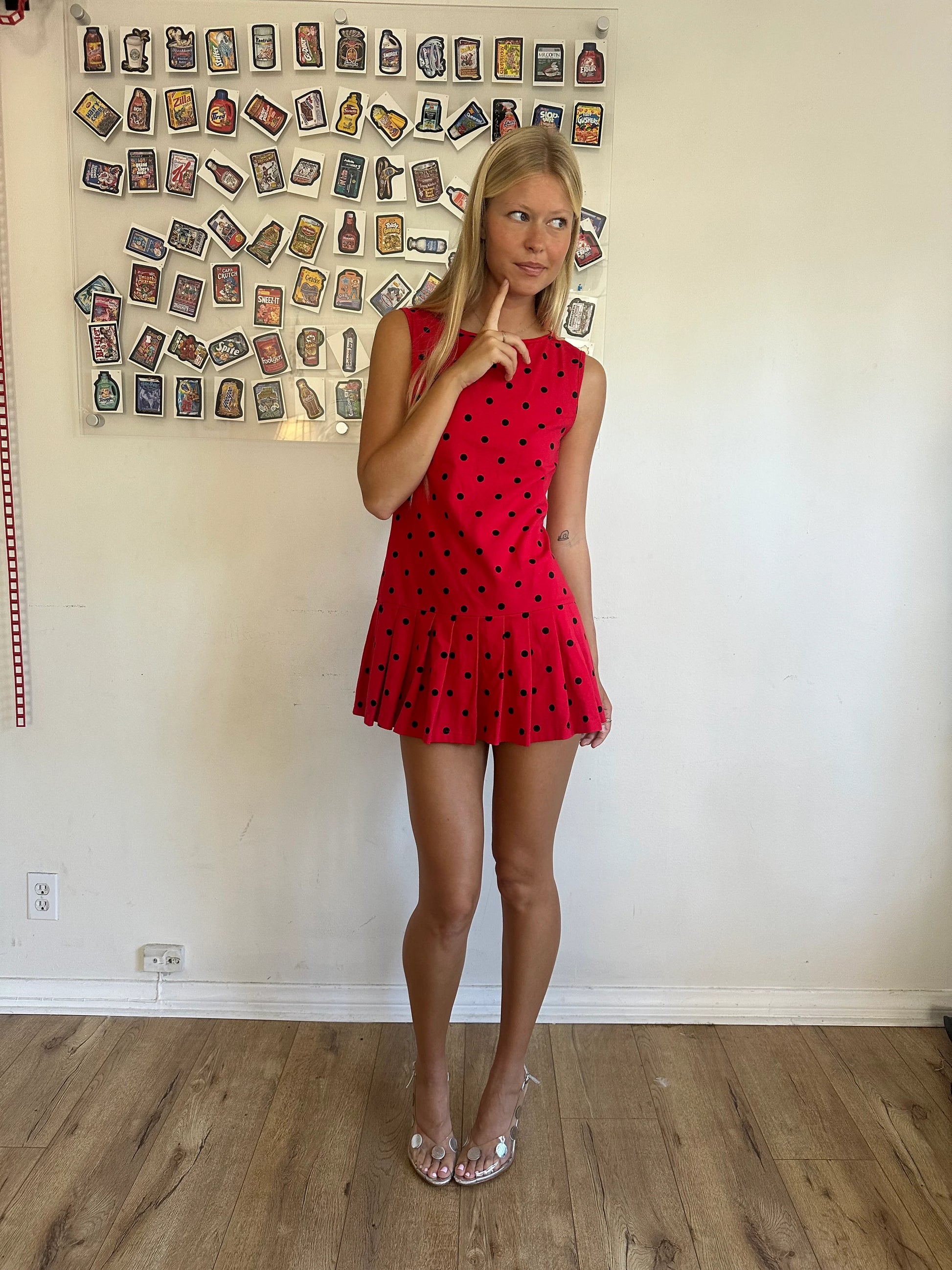 made from a comfy 97% cotton / 3% spandex blend, lola fits like a dream — soft, stretchy, and lightweight. she features a sleeveless bodice, allover mini polka dots, and a twirly drop waist pleated skirt that bounces with every step. basically… the definition of playful femininity