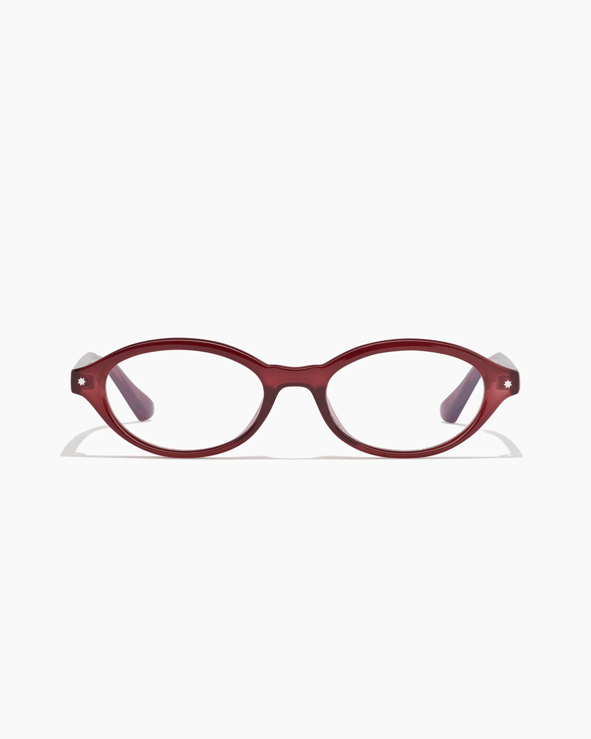 librarian chic meets office siren realness… discover nolan, our slick take on a retro inspired oval sunglass. with all the design elements and proportions of a classic silhouette found in eyewear archives to the modern touches, this deep cherry blue light blocking frame will take you from the office, to the bar, to your couch to watch tik toks... look cute while protecting your eyes.